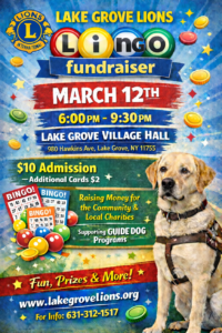 Lingo Fundraiser Mar 12, 2026 6:00 pm – 9:30 pmMarch 12, 2026 Lake Grove Village Hall980 Hawkins AveLake Grove, NY 11755View LocationMap Lake Grove Village Hall More information iCal Google View full calendar